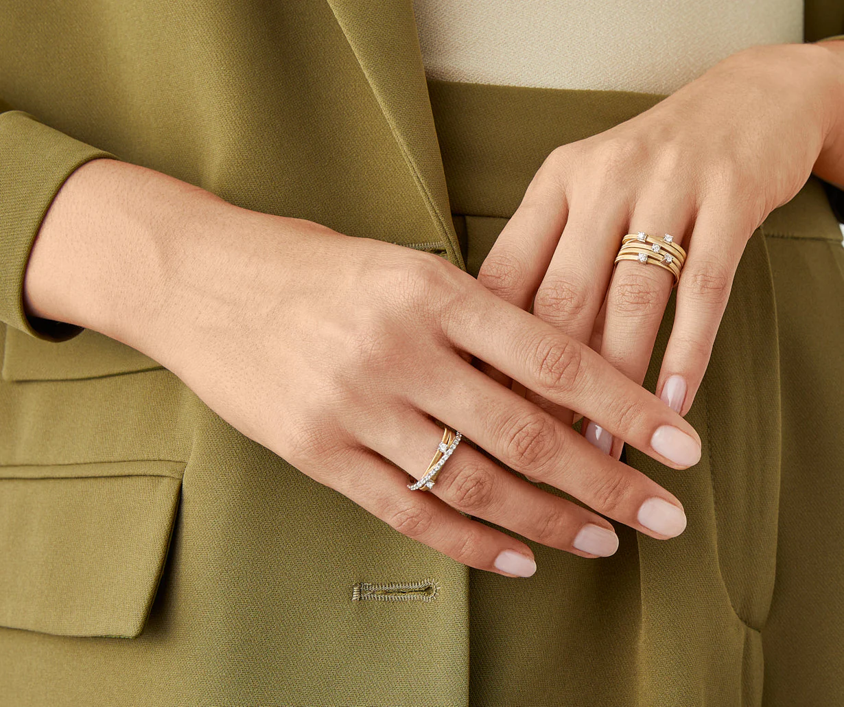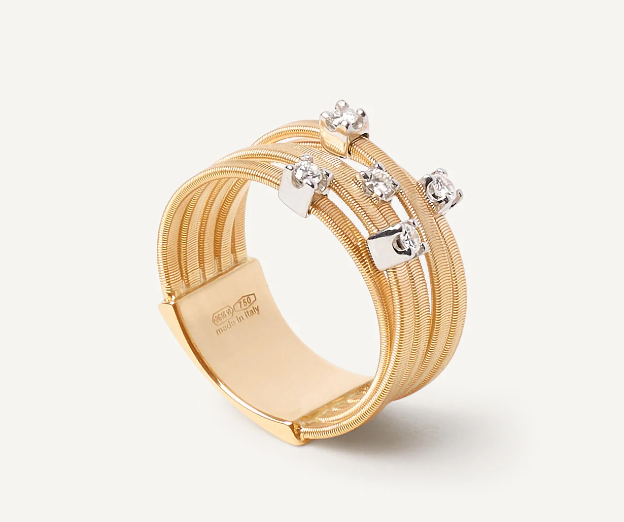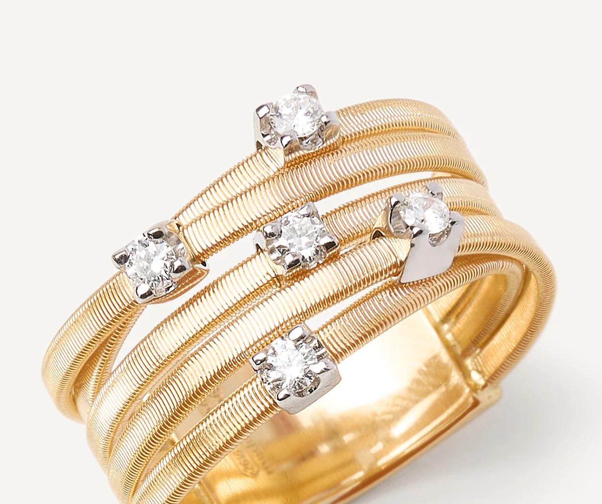 Questo sofisticato anello, in oro giallo 18kt, monta cinque fili di spirale piatta, realizzata grazie all’esclusiva lavorazione artigianale del coil, che si intrecciano tra loro. Impreziosito da una pioggia di diamanti taglio brillante, è un gioiello prêt-à-porter dall’eleganza senza tempo.