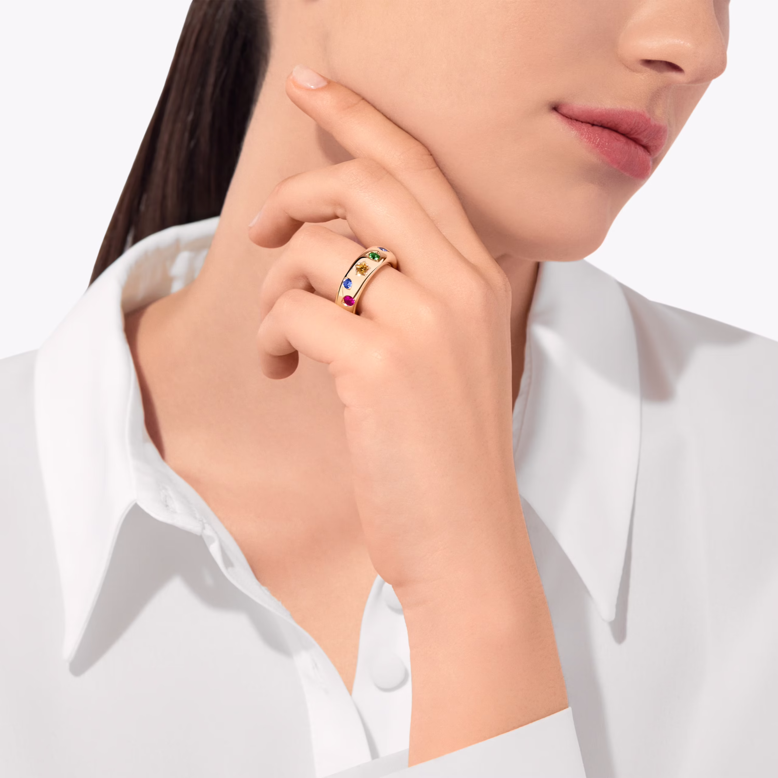 Colorato e gioioso, Iconica scintilla con i colori dell’arcobaleno che caratterizzano le gemme incastonate in forma di stella, triangolo, ovale e quadrato.