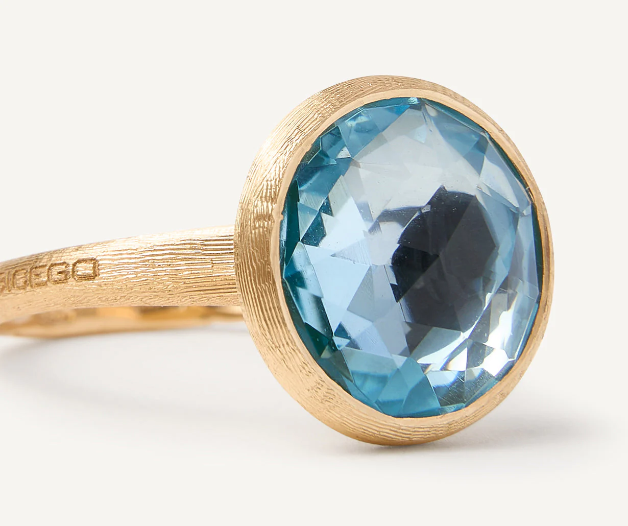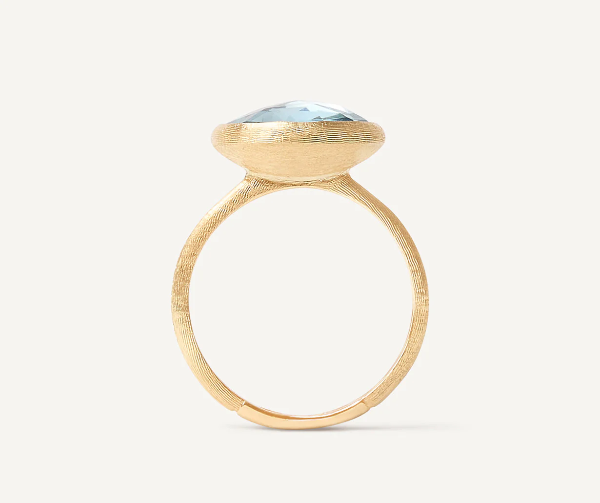 Caratterizzato da colori vivaci e linee pulite, questo anello è impreziosito da un topazio ciano accuratamente selezionato, incastonato in una montatura a castone in oro giallo 18 carati, inciso a mano secondo un’antica tecnica fiorentina. È perfetto da solo o abbinato agli altri colori della collezione.