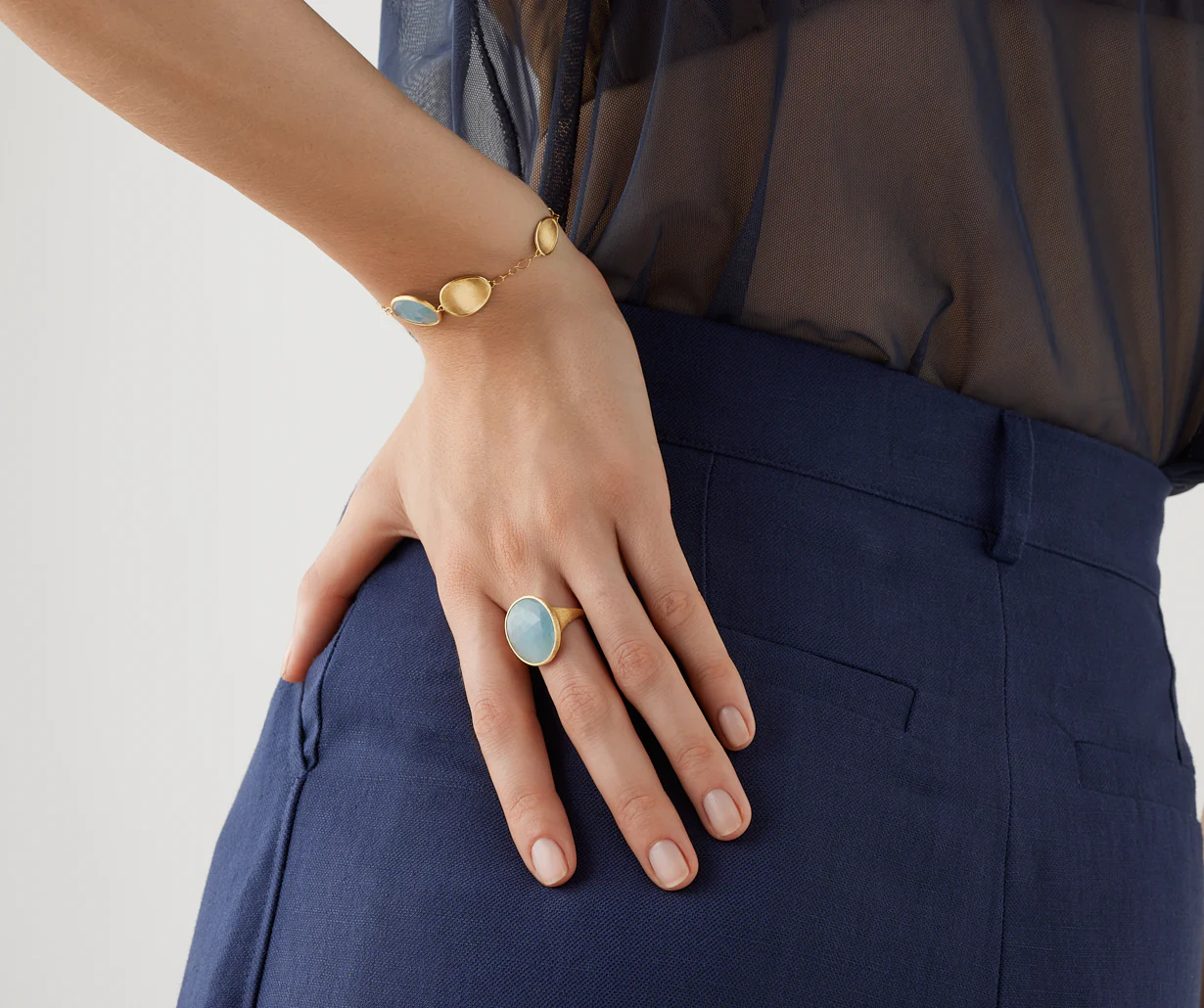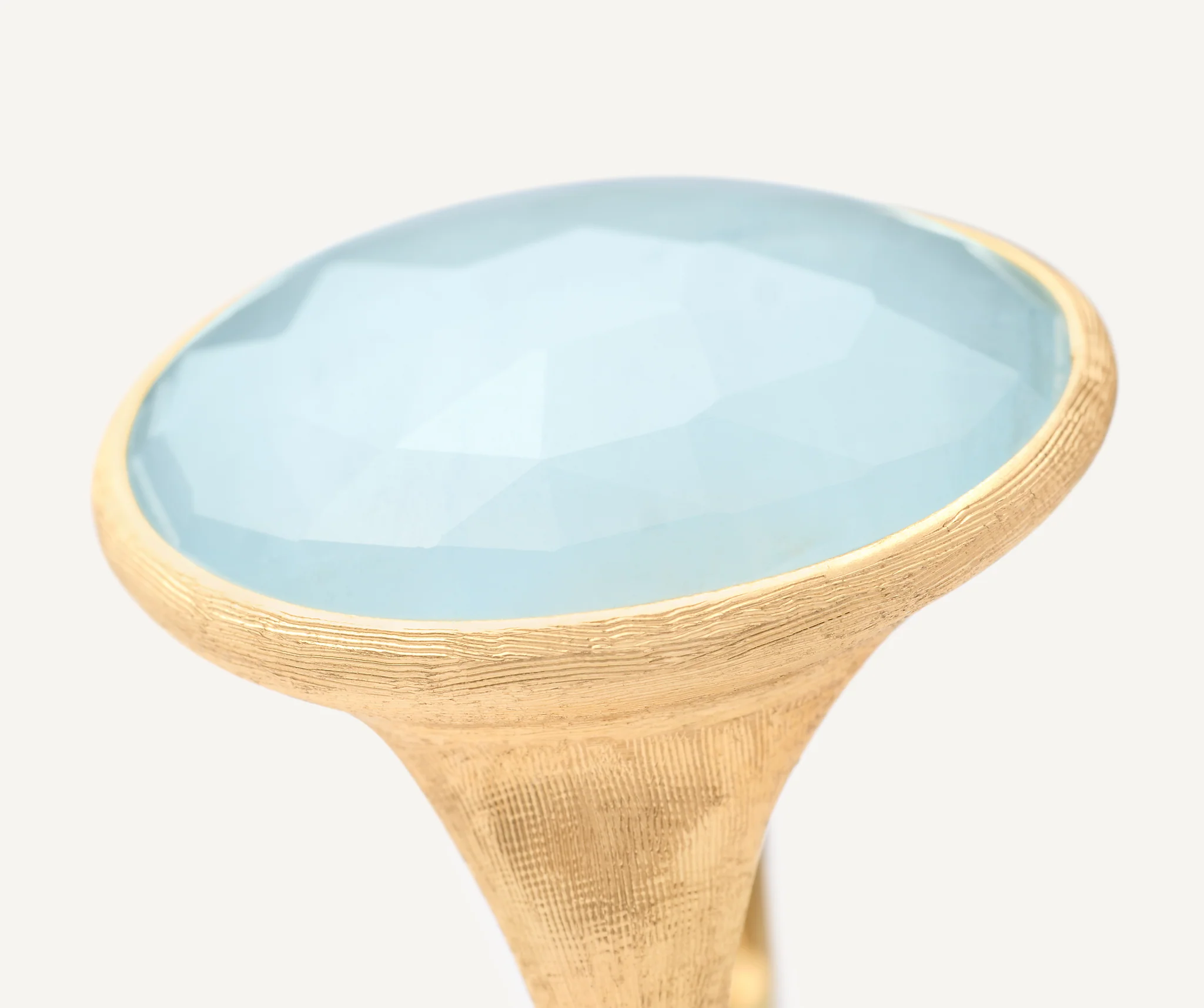 Questo elegante anello cocktail in oro giallo 18 carati è finemente inciso a mano secondo l’antica tecnica fiorentina, che conferisce al nostro oro una raffinata texture spazzolata. Incastonato in un’eleganza lussuosa, il pezzo centrale in acquamarina blu sfaccettata e quadrata affascina con la sua tonalità ipnotica, aggiungendo un tocco di fascino regale al tuo look.
