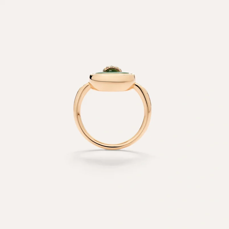 La collezione Pom Pom Dot reinterpreta l’eredità di Pomellato, traendo ispirazione da una collana in oro del 1974 ispirata a un bottone. Ogni creazione reversibile presenta due facce distinte, trasformando lo storico motivo del bottone in un emblema di connessione e protezione. Questo design contemporaneo celebra sia la funzionalità che il simbolismo attraverso gioielli versatili e giocosi. Questo nuovo anello reversibile è un capolavoro di maestria artigianale che mostra su un lato la malachite con un filo impreziosito di diamanti, scelta per la sua profonda tonalità verde e le naturali striature, mentre un semplice giro rivela una superficie in madreperla con un filo in oro rosa sull’altro lato. Il contrasto tra i pattern organici della pietra e la lavorazione precisa di Pomellato crea un design audace che cattura sia la bellezza della natura che lo spirito giocoso della Maison.