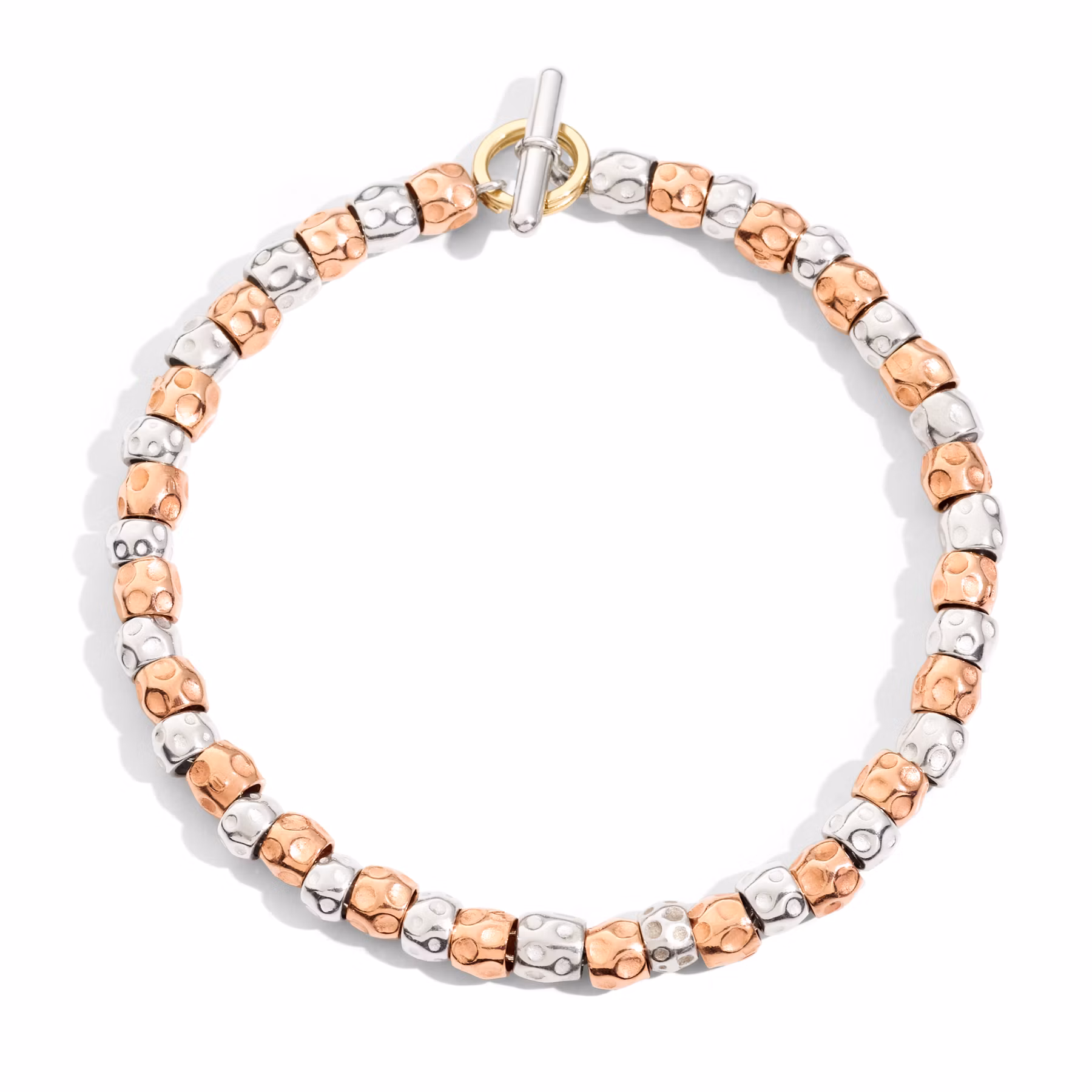 Bracciale granelli in argento 925 e oro rosa 9K, catena e t-bar in argento 925 con anello brisè in oro giallo 18K
