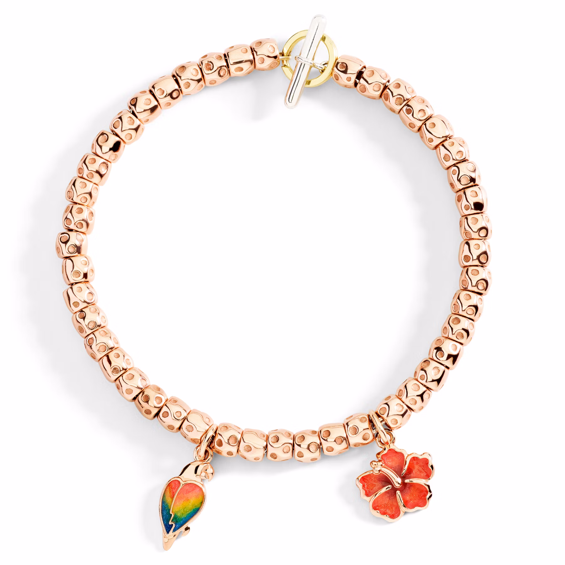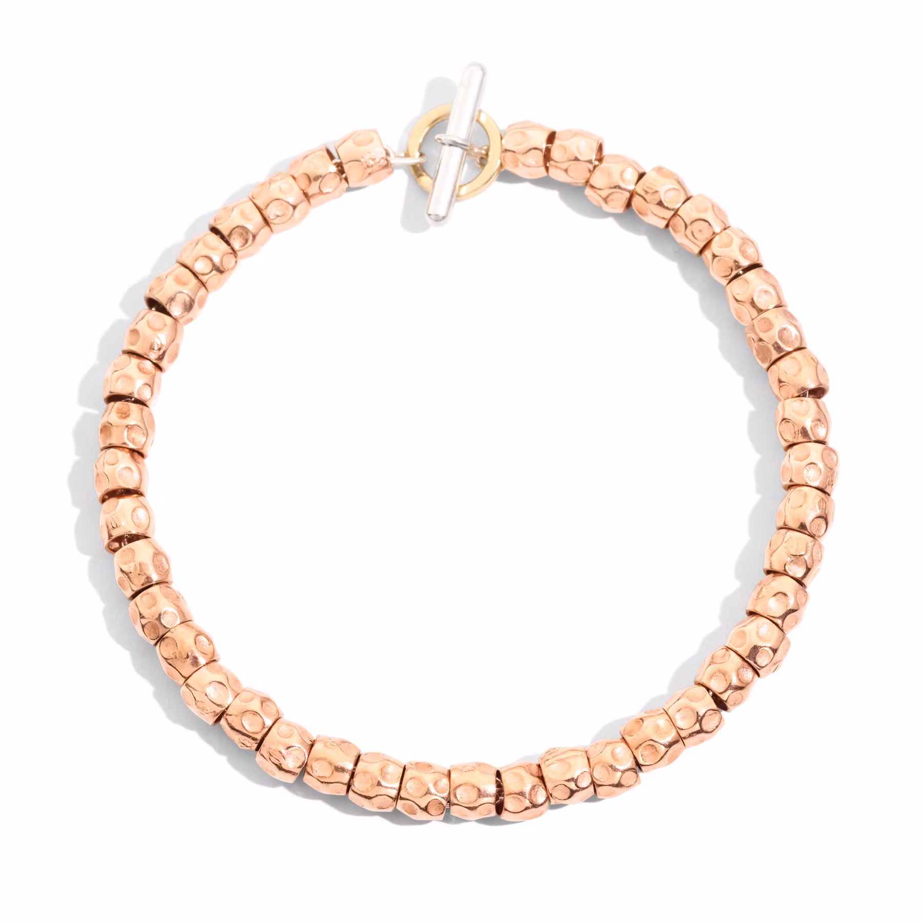 Bracciale granelli in oro rosa, catena e t-bar in argento con anello brisè in oro giallo