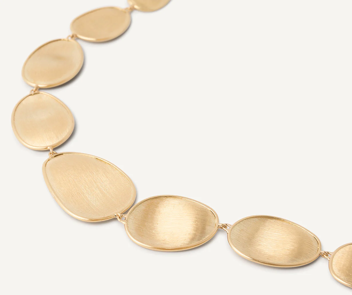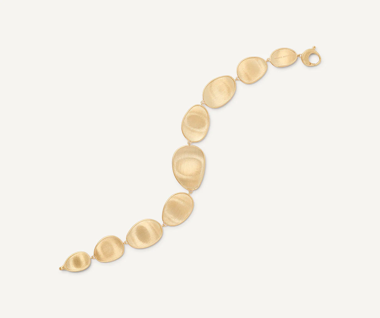 Questo elegante bracciale dalla superficie sottile e irregolare è composto da una sequenza di foglie in oro giallo 18 kt, incise a mano secondo un’antica tecnica fiorentina, per un effetto setoso e lucido che ricorda i tessuti. Affascinante ed estremamente raffinato.