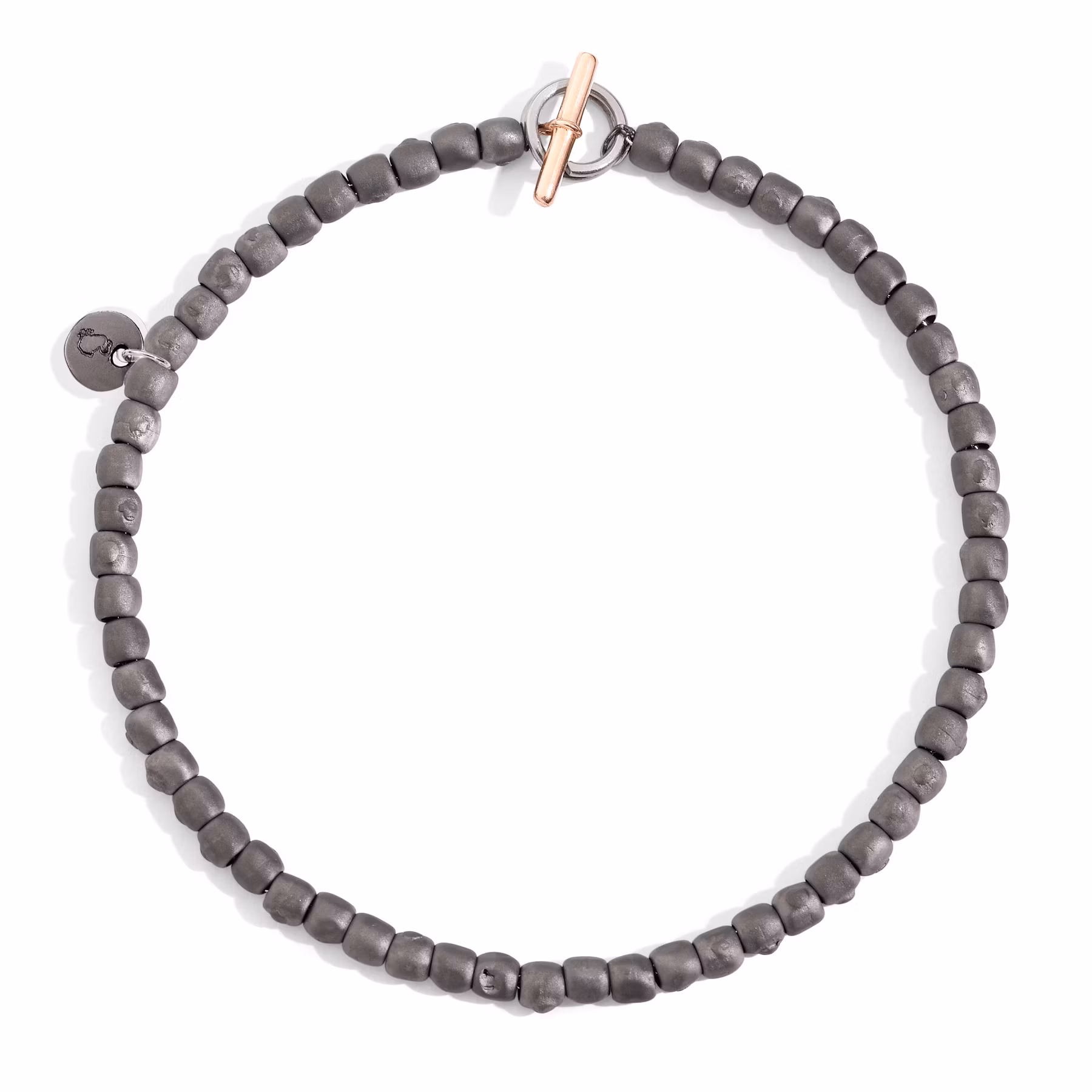 Bracciale mini granelli in titanio, catena e anello brisè in acciaio, t-bar in oro rosa 9K, piastrine in titanio e acciaio. Ago in acciaio incluso.
