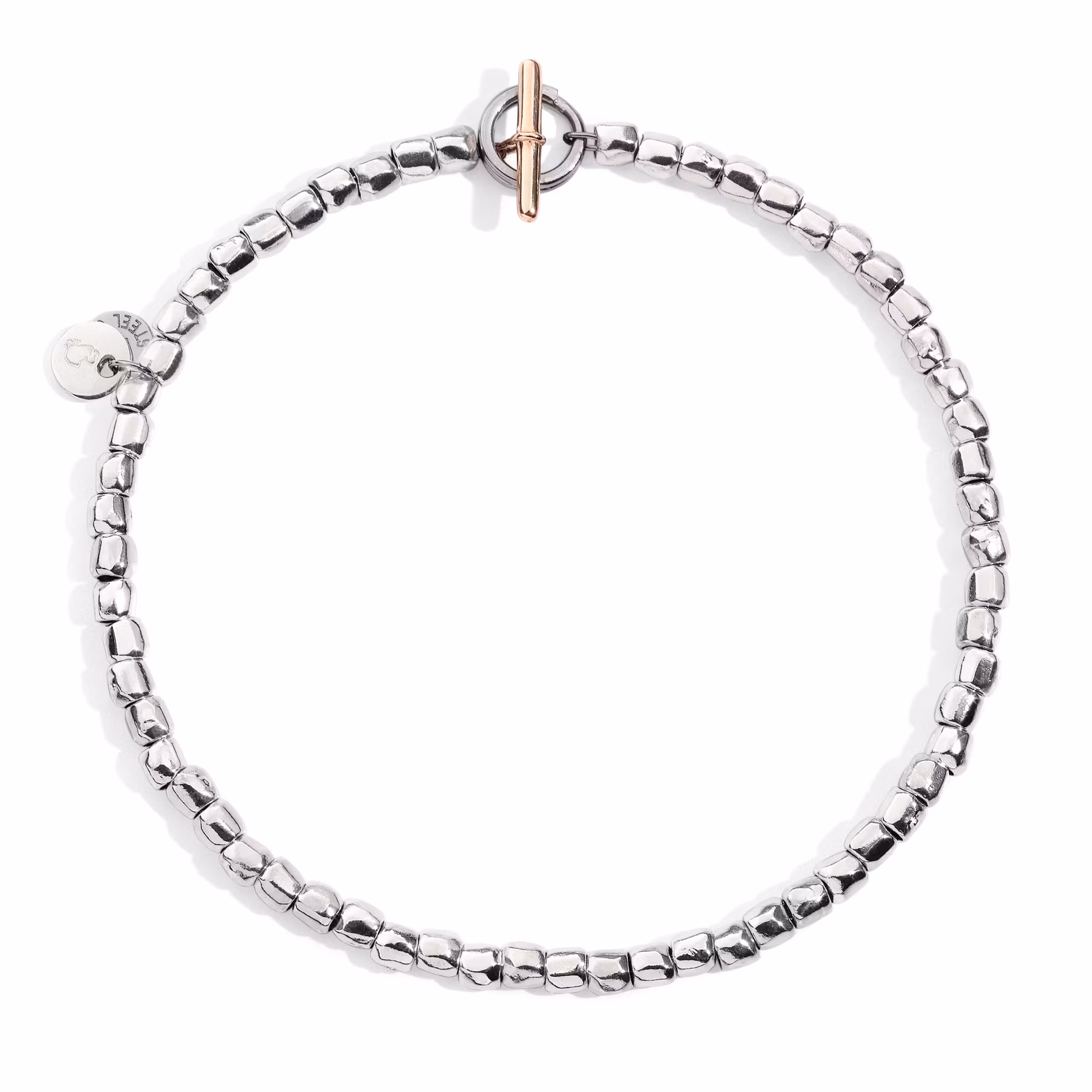 Bracciale mini granelli in argento 925, catena e anello brisè in acciaio,t-bar in oro rosa 9K, piastrine in argento e acciaio