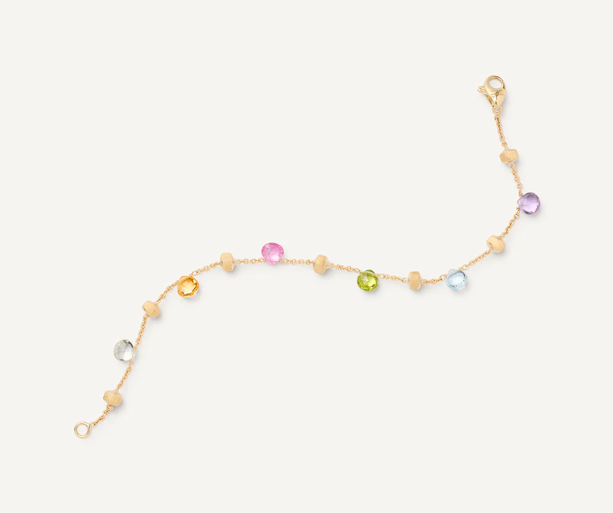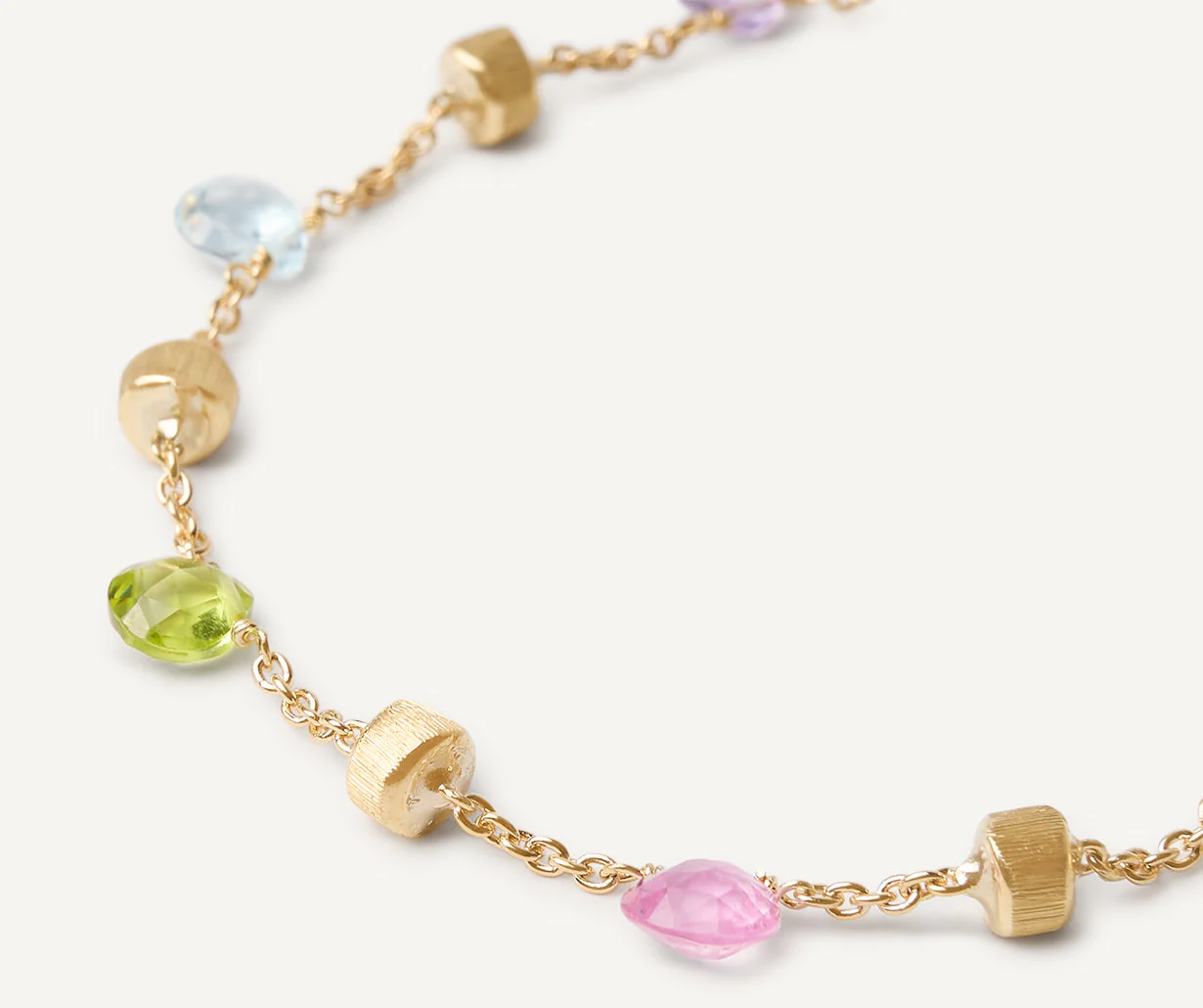 Un bracciale leggero ed elegante, perfetto da indossare con altri gioielli delle nostre collezioni. Un mix di gemme naturali taglio cuore è intervallato da preziose pepite in oro giallo 18 kt, finemente incise a mano secondo un’antica tecnica fiorentina.