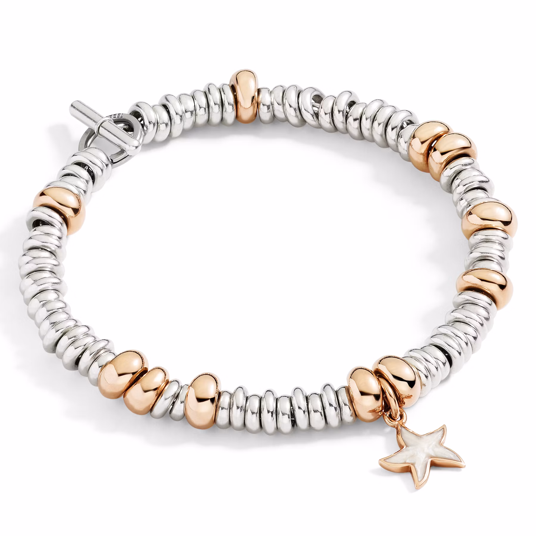 Bracciale Rondelle classiche in argento 925 e bold in argento dorato oro rosa 18K, catena e t-bar in argento 925, anello brisé in acciaio. Ago in argento 925 incluso.