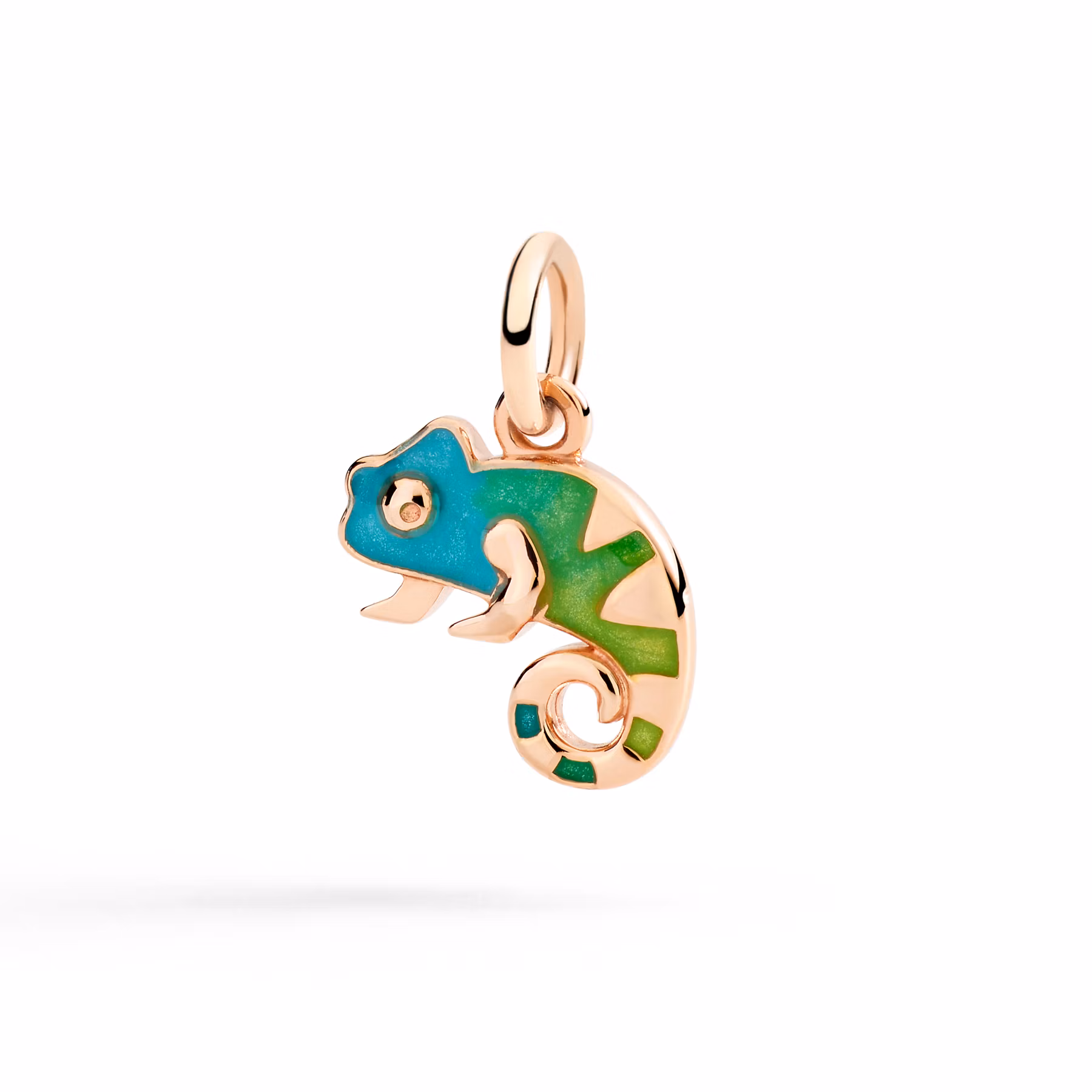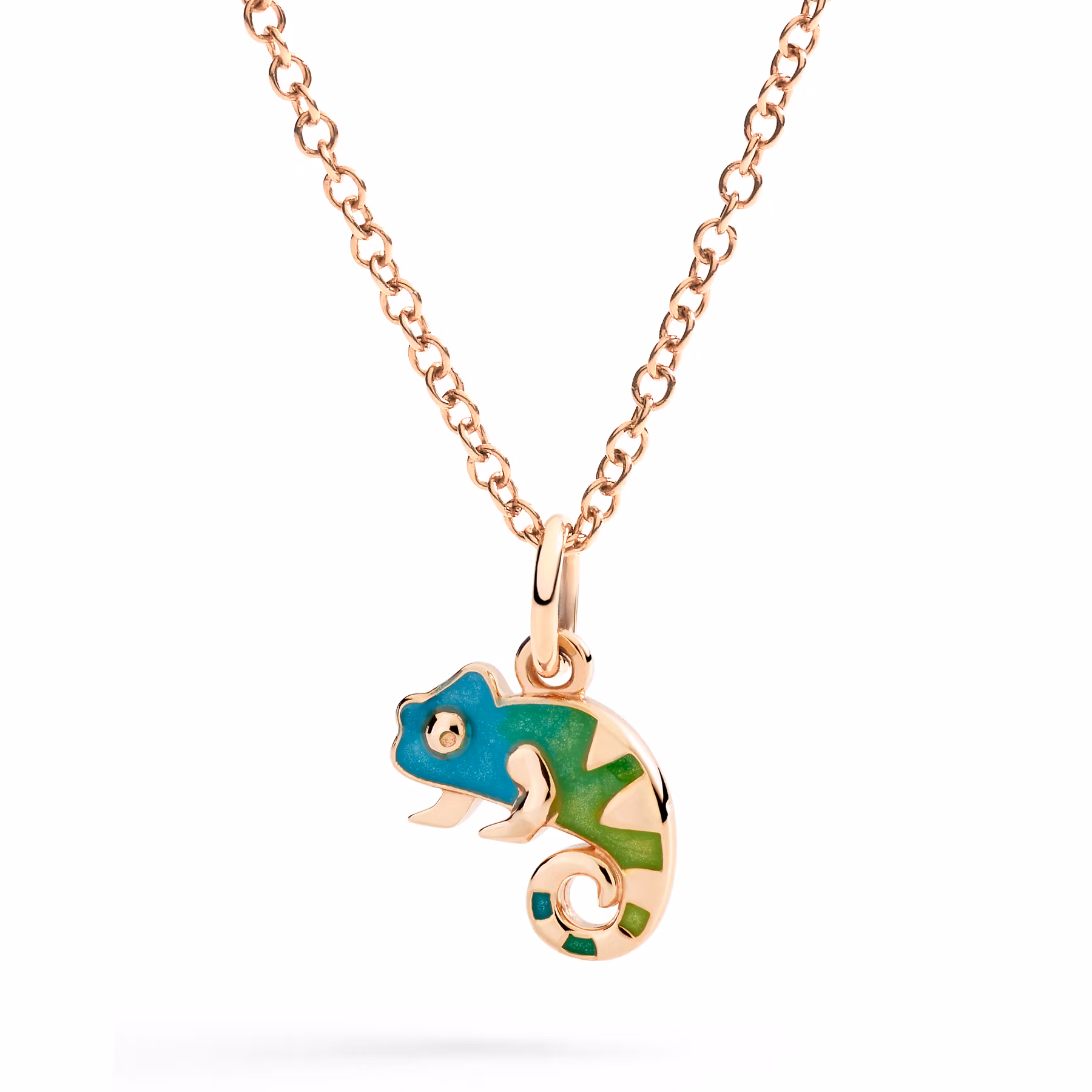 Sembra incedere cautamente il nuovo ciondolo camaleonte in oro rosa 9 K e smalto con dettagli a rilievo, occhi, zampe e coda arricciata. Lo smalto perlato, applicato a mano in tre tonalita’ di verde, sfuma a partire dalla testa fino all’estremità della coda.
