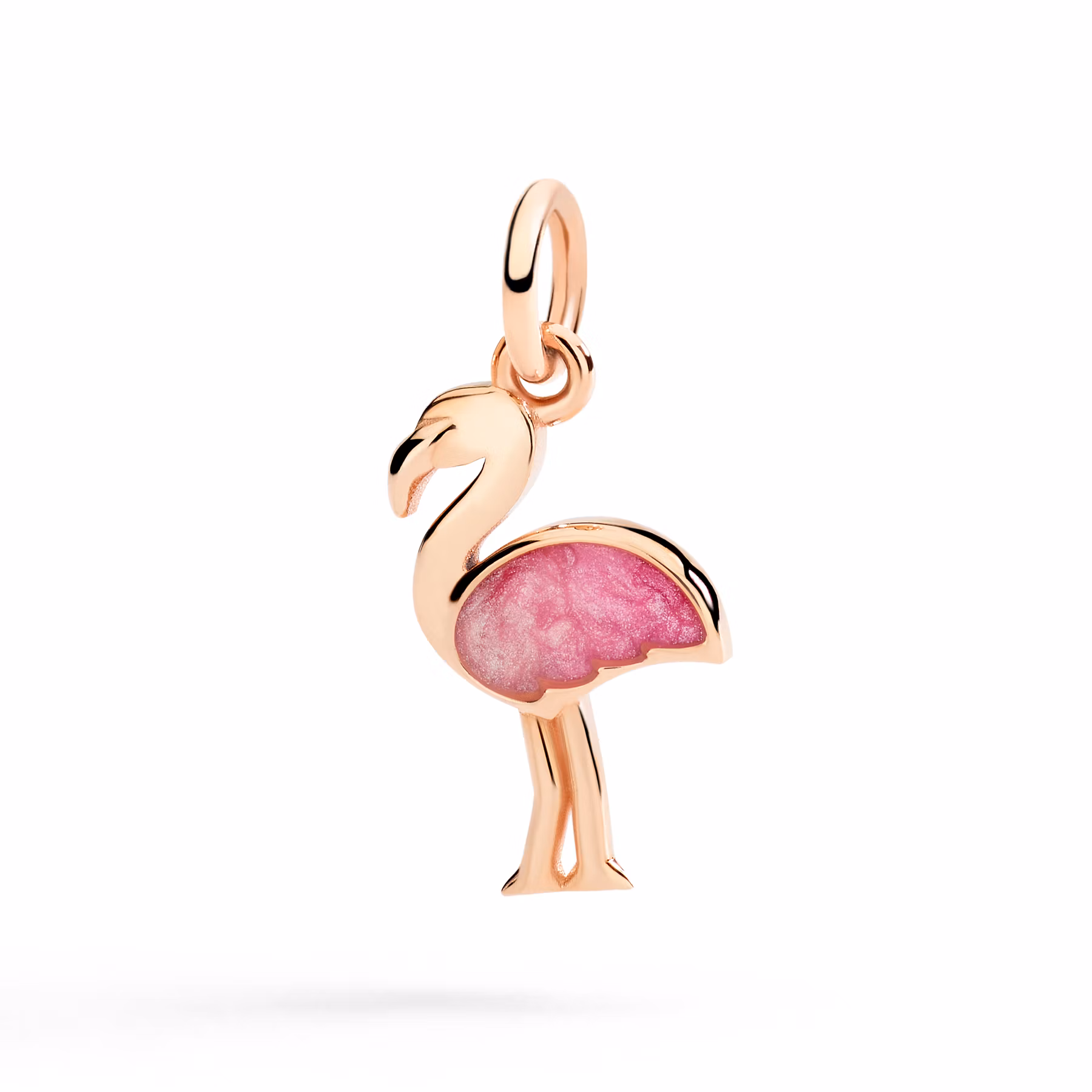 Il ciondolo fenicottero, con la sua eleganza e la sua capacità di prosperare in ambienti delicati, è realizzato in oro rosa 9K e smalto ad effetto madreperla ed è il simbolo di un messaggio potente: “Nato per emergere”.