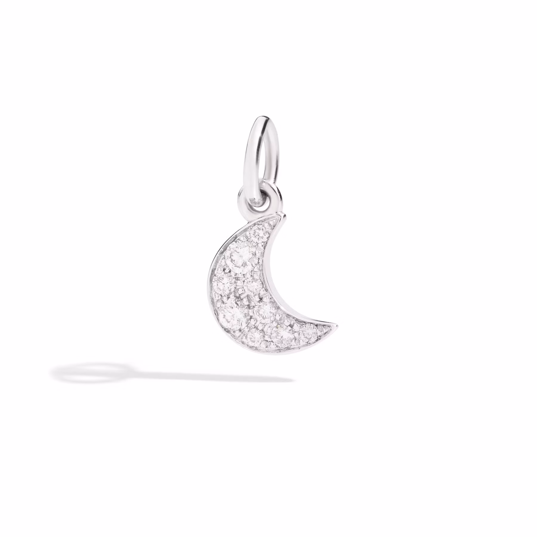 Ciondolo luna in oro bianco 18K rodiato con 9 diamanti bianchi (ct 0.14). Modello piccolo. Cordino nero incluso.