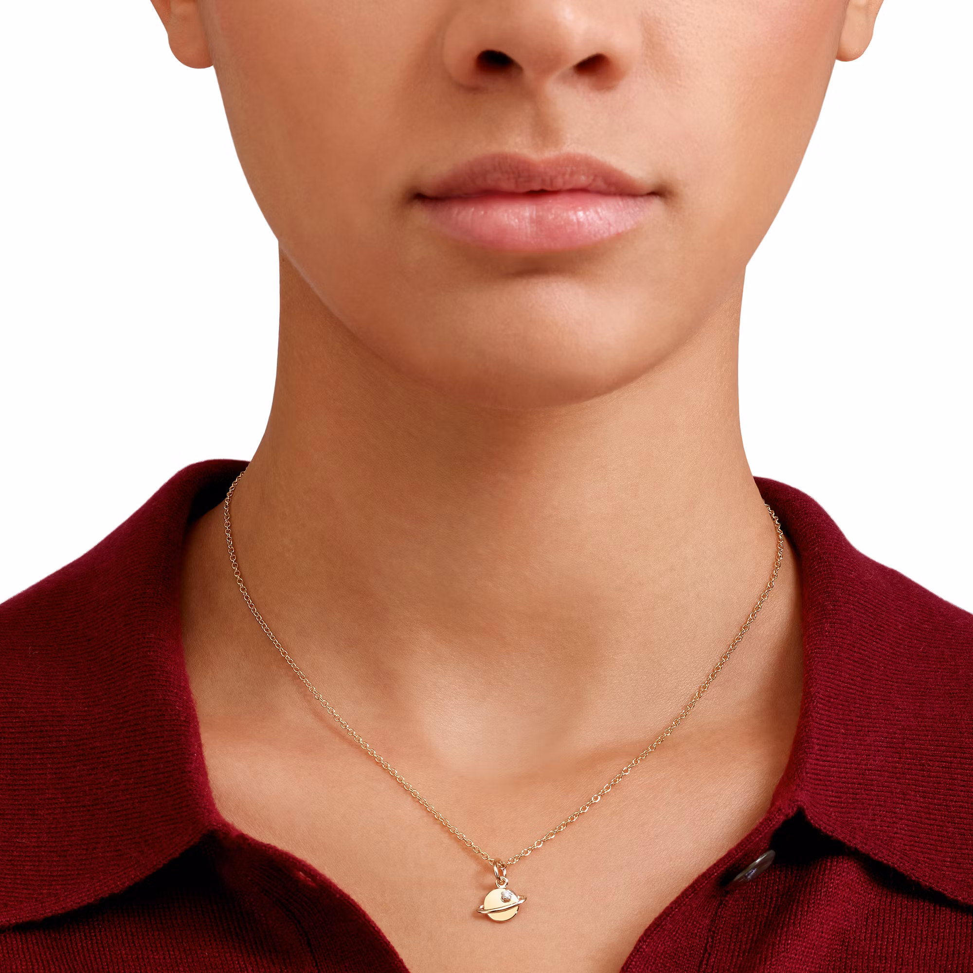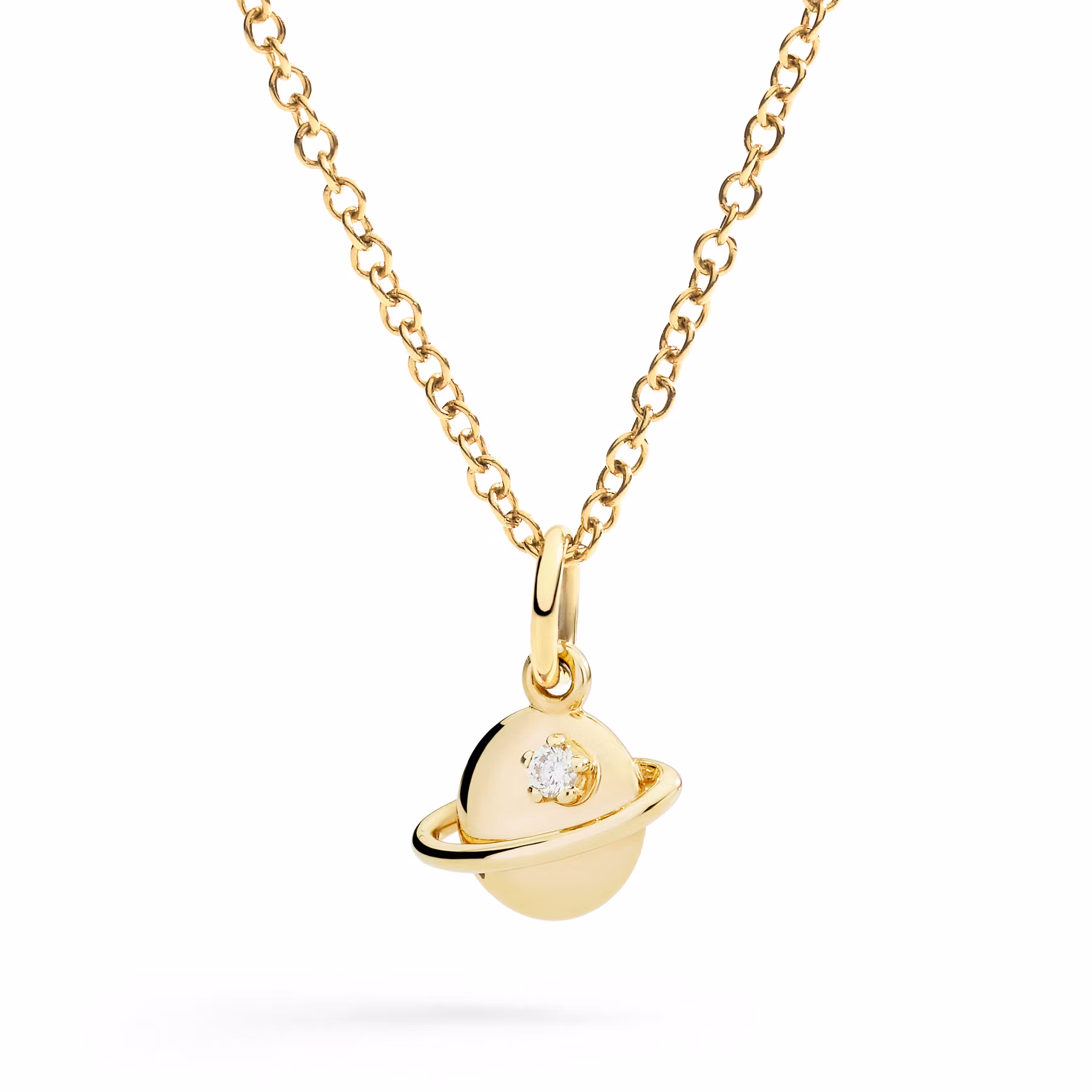 Ciondolo a forma di pianeta in oro giallo 9 carati con 1 diamante bianco (0,03 ct). Cordoncino nero incluso.