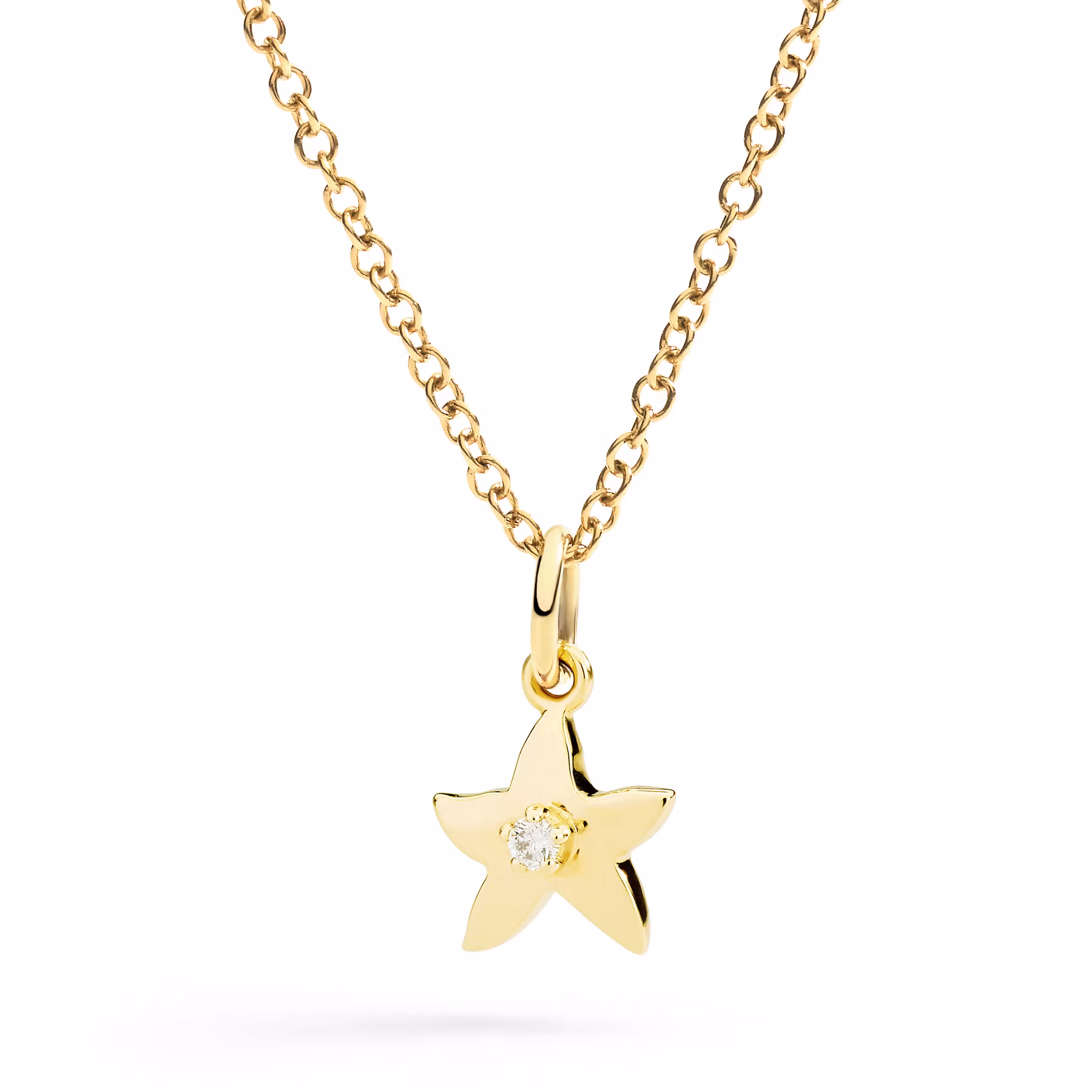 Ciondolo a forma di stella in oro giallo 9 carati con 1 diamante bianco (0,03 ct). Cordoncino nero incluso.