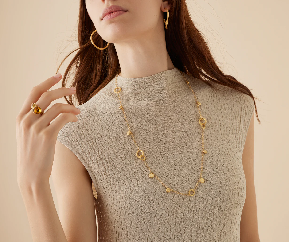 Collana lunga con charm irregolari in oro giallo 18 kt, finemente incisa a mano con un’antica tecnica fiorentina. Perfetta da abbinare ai diversi pendenti componibili della collezione Jaipur.