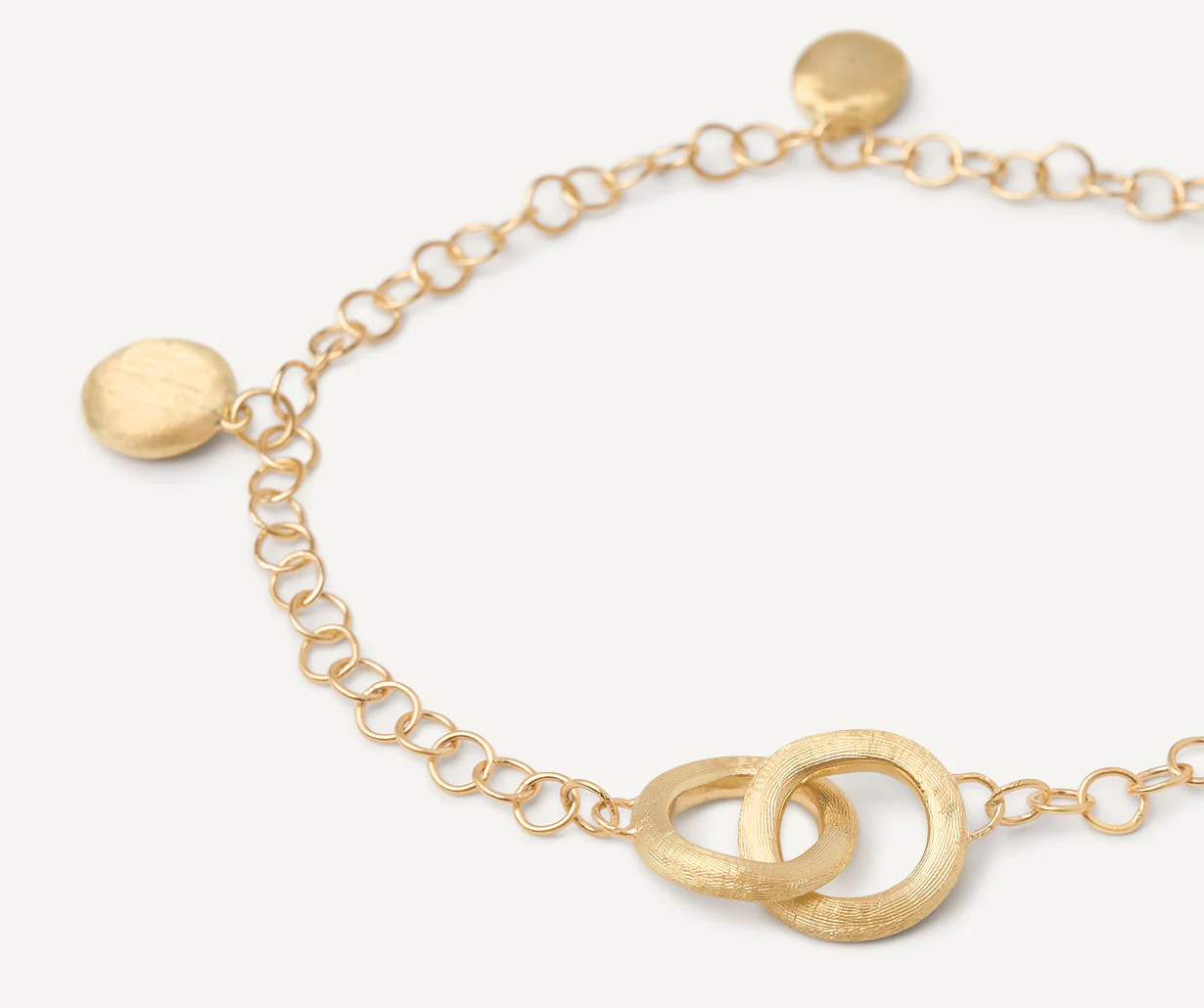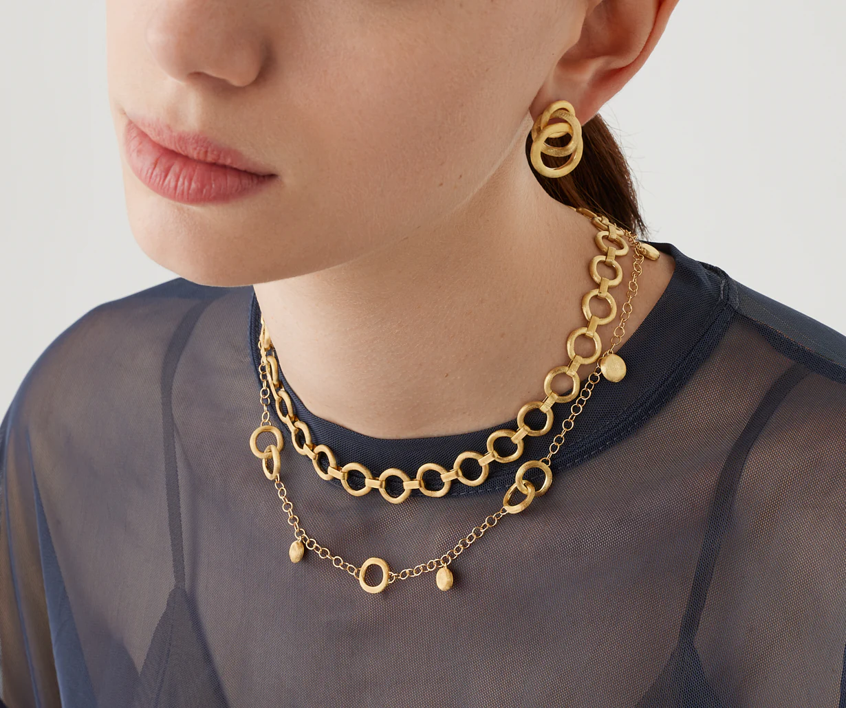 Collana corta irregolare in oro giallo 18 kt con ciondoli, finemente incisa a mano con un’antica tecnica fiorentina. Ideale da abbinare ai diversi pendenti componibili della collezione Jaipur.