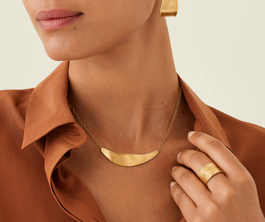 Delicata catena girocollo con elemento centrale in oro giallo 18 kt, finemente inciso a mano con l’antica tecnica fiorentina e dalla forma volutamente irregolare e imperfetta. Un punto luce originale e di grande impatto.