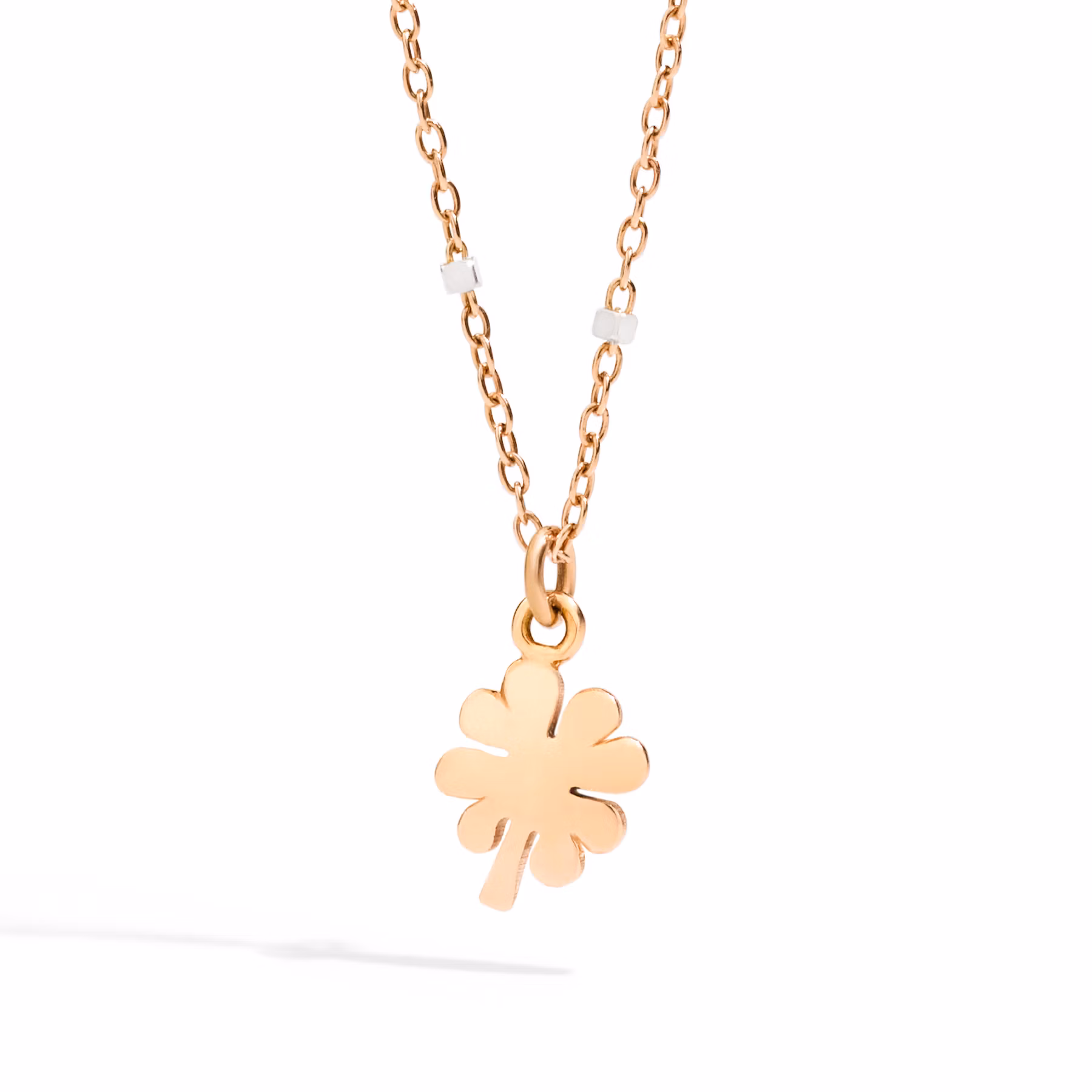 Collana in oro rosa 9K e oro bianco 9K rodiato con ciondolo quadrifoglio modello mini in oro rosa 9K e piastrina in oro rosa 9K.
