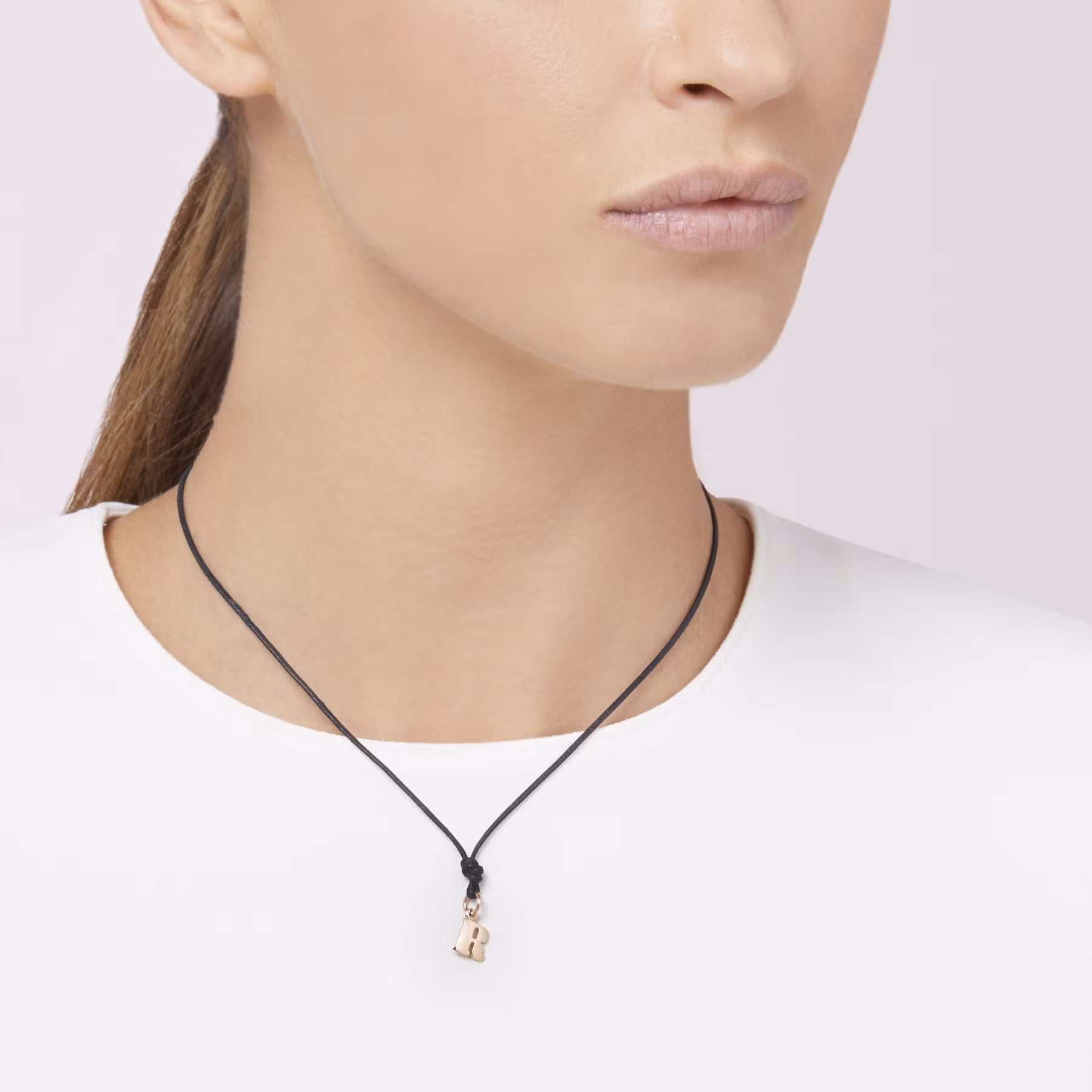 Ciondolo lettera R in oro rosa 9K. Cordino nero incluso.