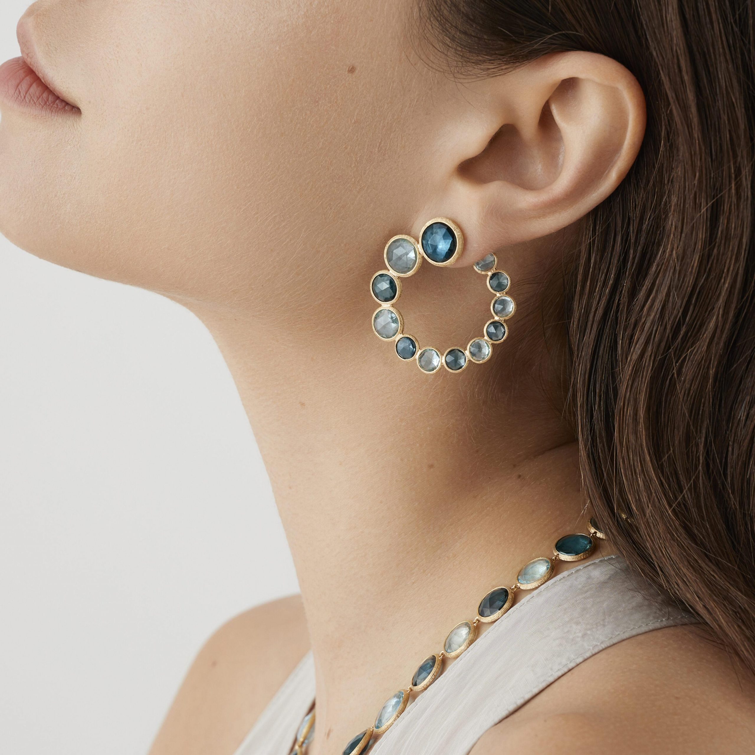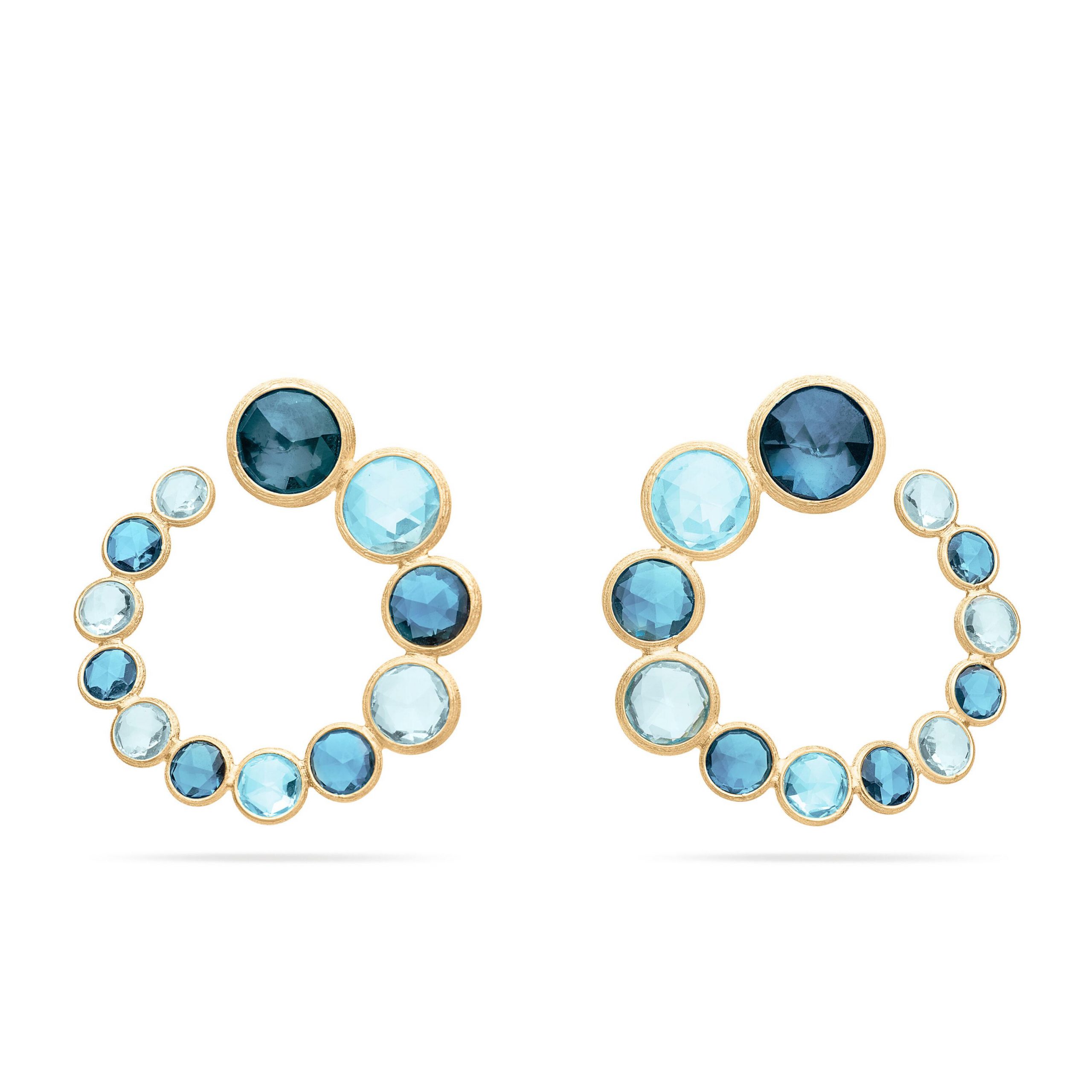 Topazi azzurri e topazi London dal taglio rosetta, accuratamente scelte per intensità e purezza, donano carattere e brillantezza a questi orecchini della collezione di alta gioielleria di Marco Bicego. L’oro giallo 18kt è finemente inciso a mano con l’antica tecnica del bulino millerighe.
