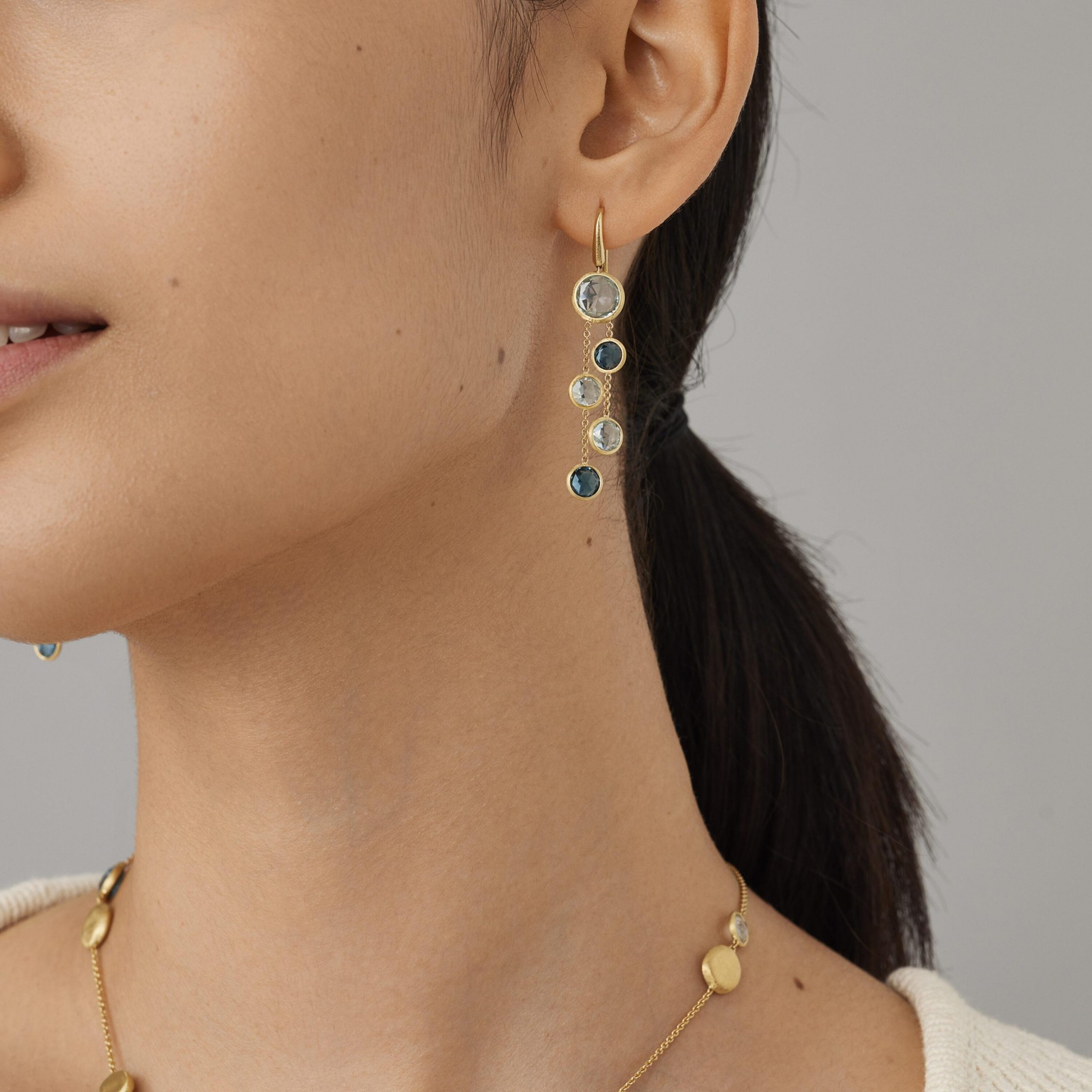 Una cascata di gemme colorate per questo orecchino multifilo. Ogni pietra, accuratamente selezionata per intensità e purezza, viene valorizzata da una ghiera d’oro giallo 18 kt finemente incisa a mano con l’antica tecnica del bulino millerighe.