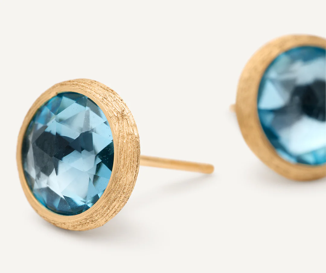 Questi orecchini a bottone con topazio celeste taglio rosa, luminosi, intensi e dai colori vivaci, sono impreziositi da una lunetta in oro giallo 18 carati, finemente incisa a mano secondo l’antica tecnica fiorentina.