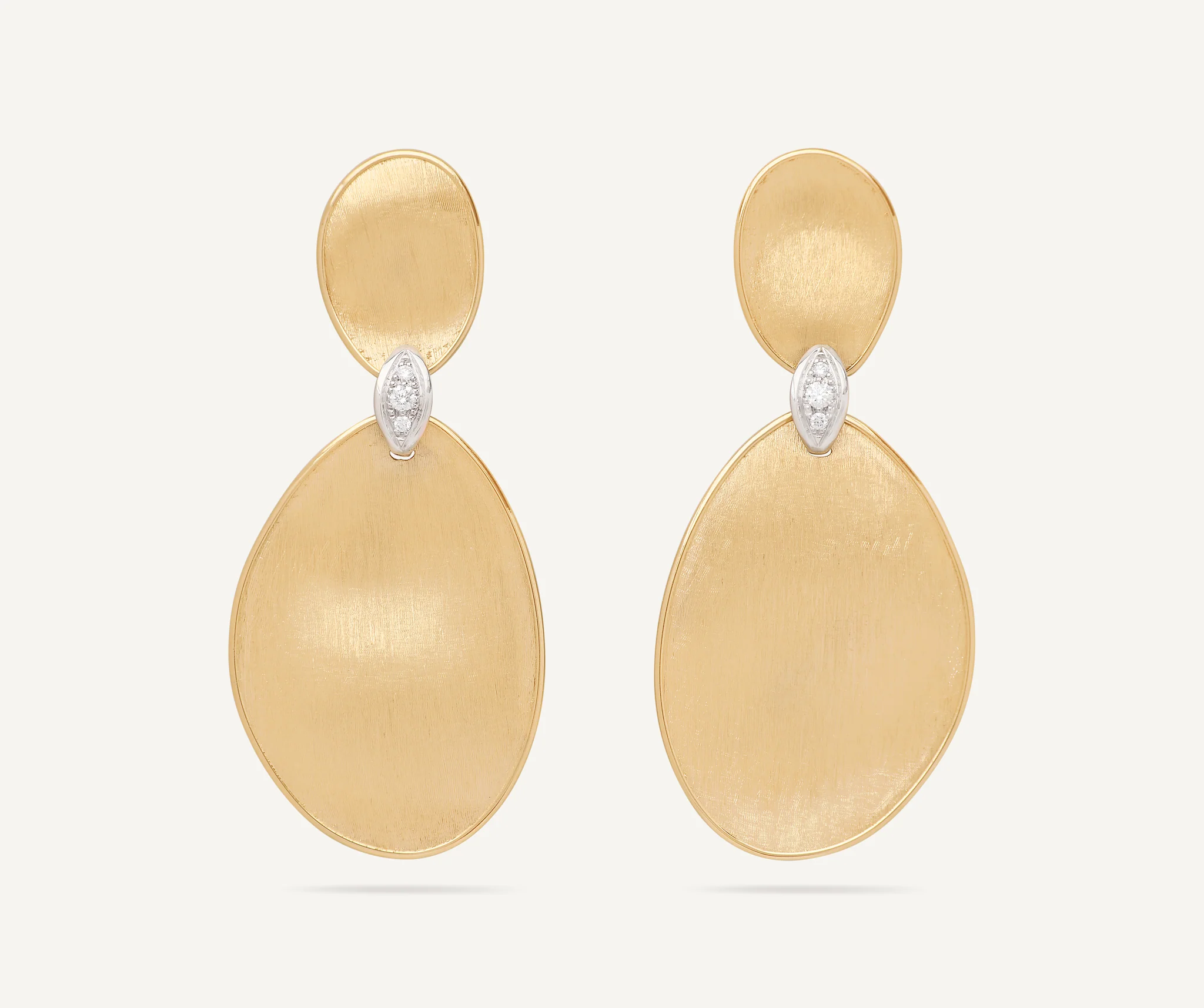 Semplici ma sofisticati, questi orecchini chandelier si compongono di foglie in oro giallo 18 carati finemente incise a mano secondo l’antica tecnica del bulino millerighe. Gli elementi in pavé di diamanti, che uniscono le foglie tra loro, aggiungono un delicato tocco di luce arricchendo le linee organiche del design.