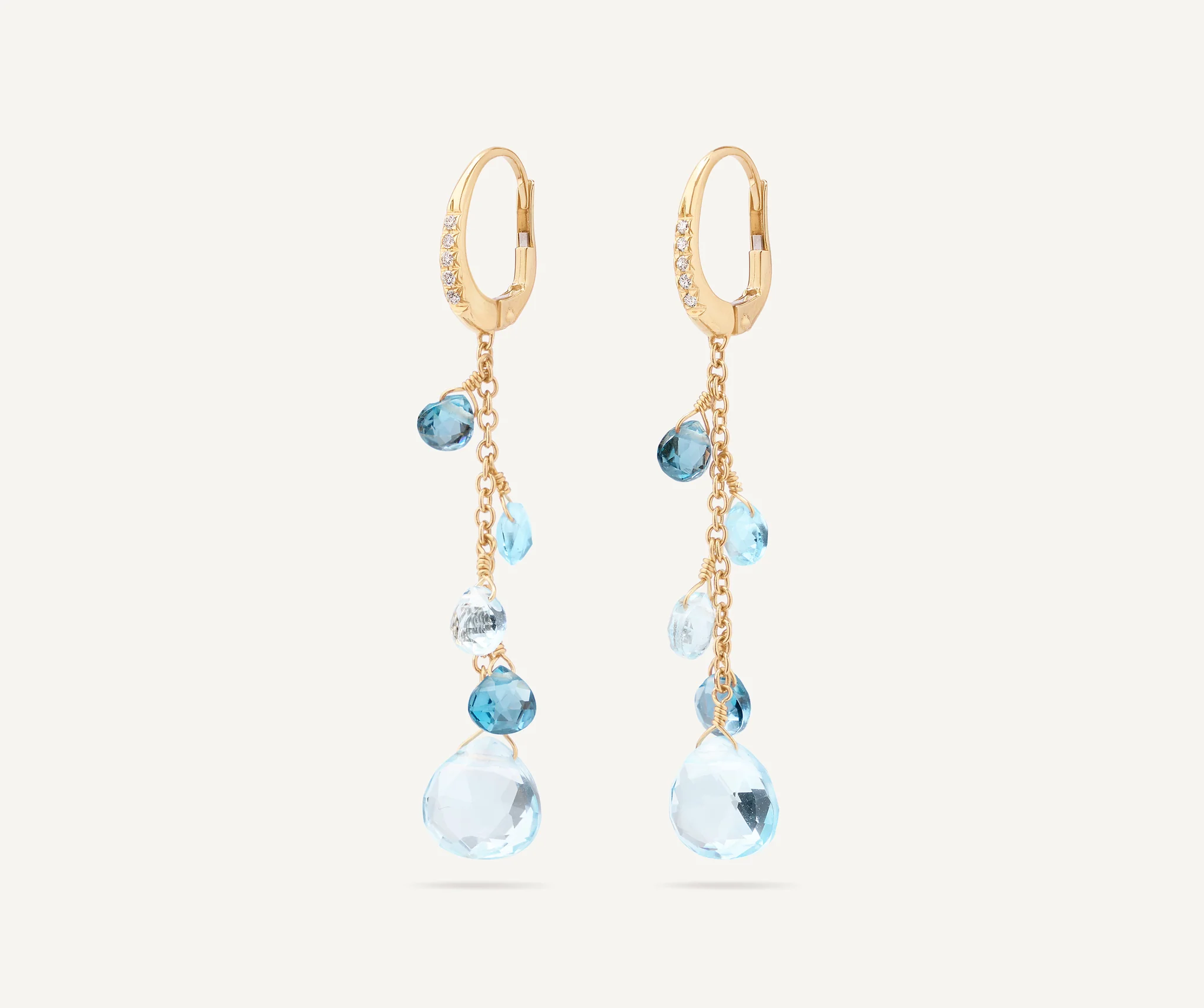 Questi orecchini pendenti in oro giallo 18 carati sono impreziositi da una preziosa chiusura a clip con diamanti taglio brillante e da una cascata di topazi taglio cuore finemente selezionati che arricchiscono il gioiello con i loro colori intensi.